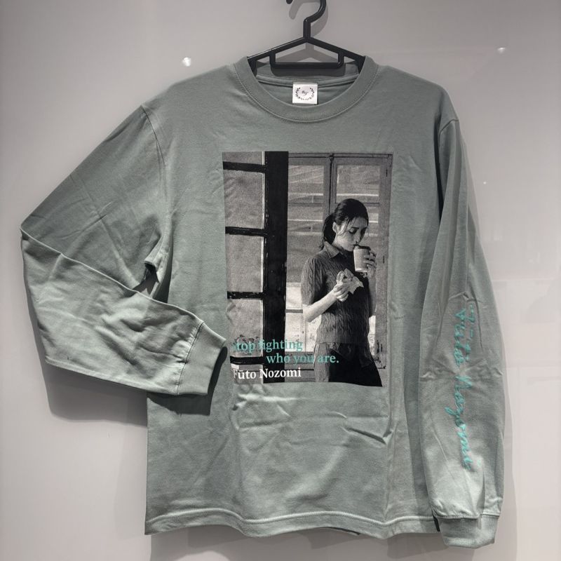Tシャツとは異なるnozomist collection 2025のための撮り下ろし写真+本人の好きな名言「Stop fighting who you are.(自分と戦うのをやめよう)」が入ったフォトグラフィックロンT。